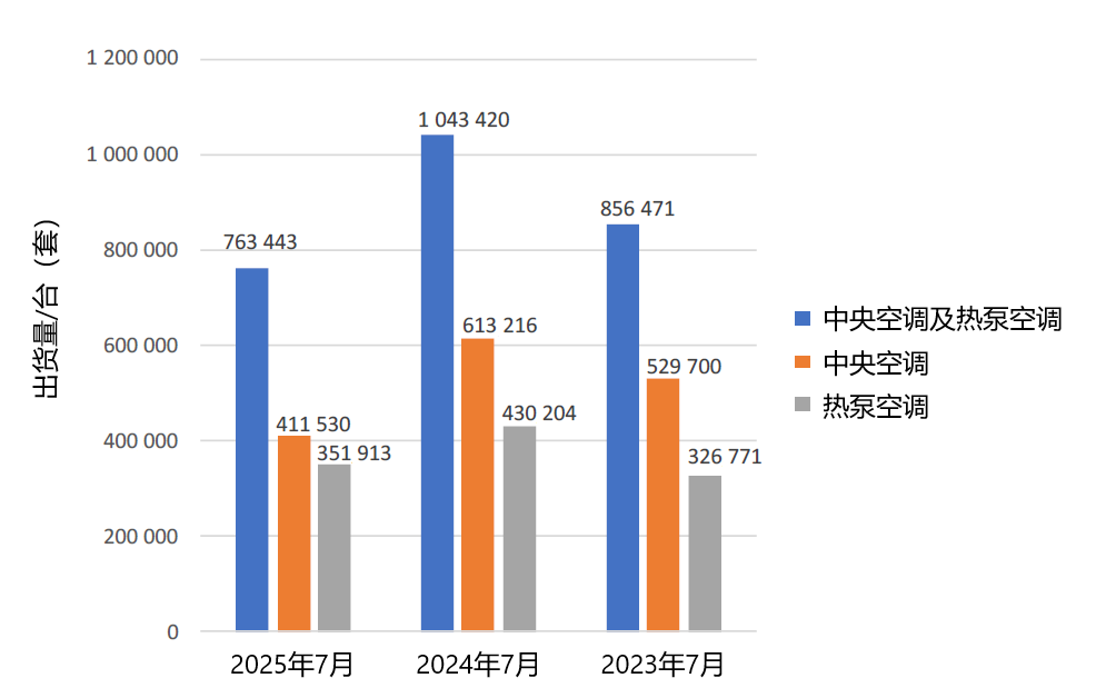 近日,AHRI(美国空调供暖和制冷工业协会)发布了美国中央空调相关设备2025年7月的出货数据。2025年7月份,美国中央空调和热泵空调总出货量为763 443台(套),比2024年7月的